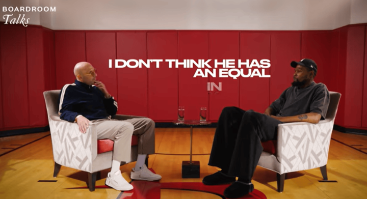 虎扑03月23日讯本日,火箭球员凯文-杜兰特在Boardroom中进行了一双一专访: