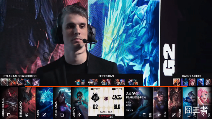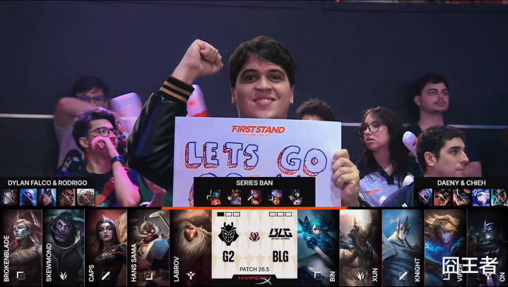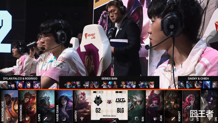第二局比赛,G2蓝色方,禁用:发条、瑞兹、韦鲁斯、梅尔、安蓓萨,采取:BrokenBlade亚恒、SkewMond蒙多、Caps妖姬、Hans Sama飞机、Labrov巴德;BLG红色方,禁用:卡尔玛、兰博、艾希、贾克斯、鳄鱼,采取:Bin格温、Xun潘森、knight加里奥、Viper伊泽瑞尔、ON慎