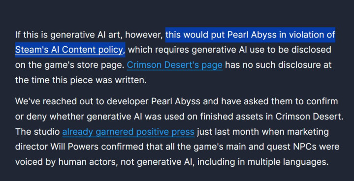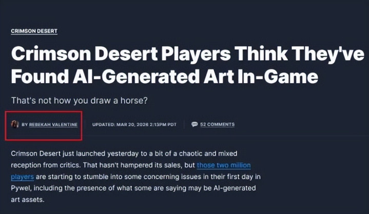 而当今,她又把锋芒瞄准了韩国厂商 Pearl Abyss,原因是他们的新作《红色沙漠》被质疑使用了AI生成画作。