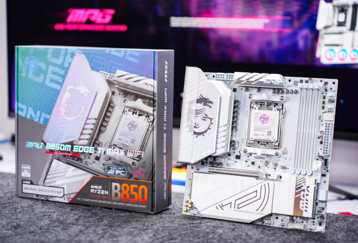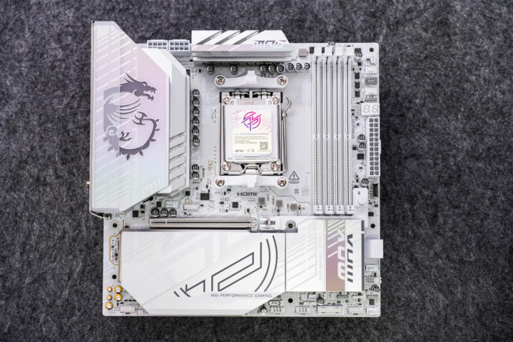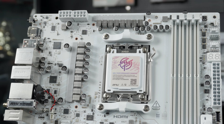 CPU选好了,主板的选定告成决定了整机的稳定性、膨胀性和可玩性,而能好意思满适配AMD Ryzen7 9800X3D,又能与微星×芙莉莲联名立场呼应的,非微星MPG B850M EDGE Ti MAX WIFI刀锋钛MAX主板莫属。动作微星MPG系列的高端MATX主板,这款主板不管是用料、供电已经膨胀性,都号称同级别天花板,何况颜值在线,银白色PCB板搭配钛色装甲,质感拉满,与联名款显卡的白紫配色黑白分明,把它装进机箱,就像给“魔法中枢”配上了坚固的“魔法阵基座”。