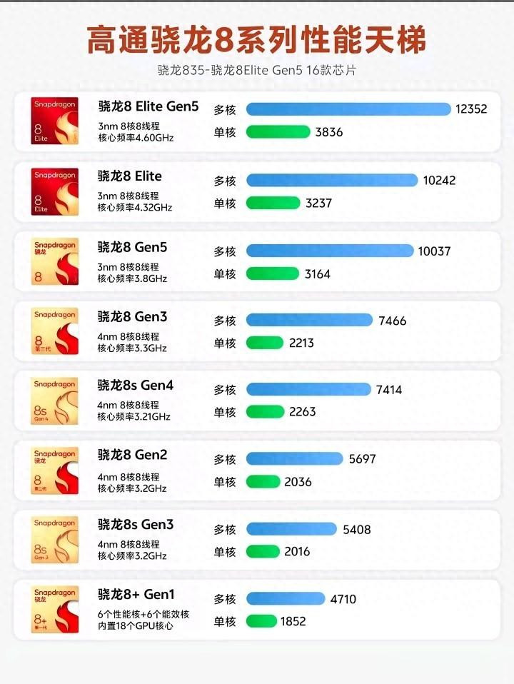 2026年3月高通骁龙8系列性能天梯图明晰地展示了从骁龙8 Plus Gen1到骁龙8 Elite Gen5这十六款芯片的演进经过。这张图表不仅纪录了频率的栽种和工艺的迭代,更见证了智妙手机核默算力在往时几年间的爆发式增长,转头过往,骁龙8 Plus Gen1四肢早期的代表作,选用6个性能核加6个能效核的盘算推算,内置18个GPU中枢,其单核跑分仅为1852分,多核跑分为4710分,这在其时虽属主流,但放在2026年的今天已显致力。随后的骁龙8s Gen3将单核性能栽种至2016分,多核达到5408分,标记着中端芯片运转向旗舰性能靠拢。真确的转动点出咫尺骁龙8 Gen2,这款芯片单核突破2036分,多核跃升至5697分,奠定了后续几代高性能的基础。