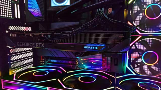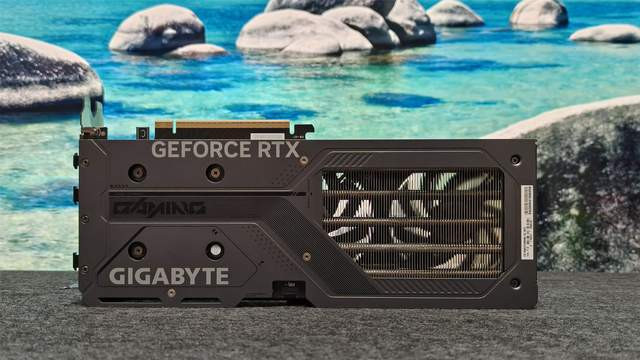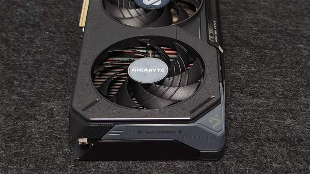 显卡后头依旧是满满的金属元素,除了高强度合金材质的金属背板粗鲁充分保证刚度除外,咱们还可以看到GIGABYTE以及GEFORCE RTX的诸多元素,电竞立场十足,右侧也有镂空盘算合作前边的三电扇盘算来辅助进风从而达成更好散热的终端。