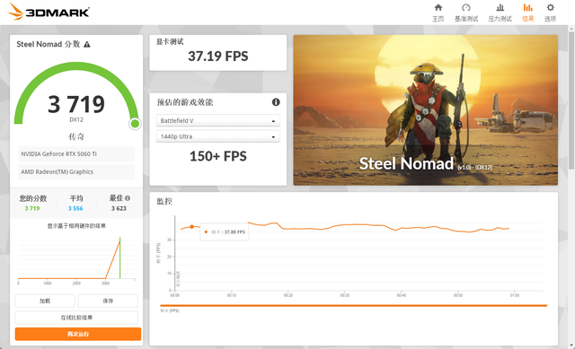 在3Dmark中测试可靠性、得当性和握续性能的Steel Nomad测试中,总成绩为3719,其中显卡测试成绩为37.19FPS。