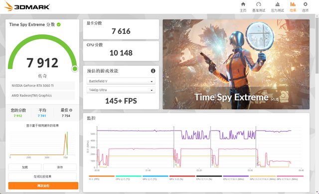 在3DMark的Time Spy Extreme(DX12+4K渲染差别率)测试中,总成绩为7912,其中显卡分数为7616。