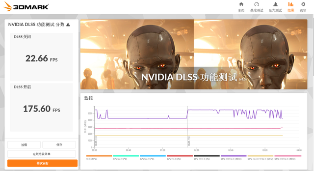 在3Dmark NVIDIA DLSS功能测试中,关闭DLSS 4时帧数为22.6FPS附近,开启DLSS 4 2x之后帧数上升为95.8FPS,开启DLSS 4 4x之后帧数上升为175.6FPS。