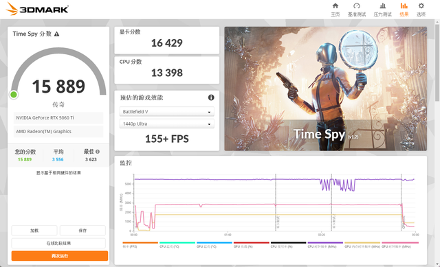 在3DMark的Time Spy(DX12+2K渲染差别率)测试中,总成绩为15889,其中显卡分数为16429。