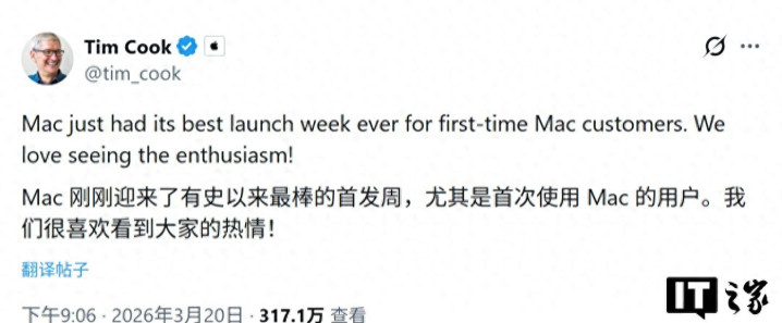 苹果本年推了个叫MacBook Neo的新簿子,3月11号开卖,一周后库克发帖说“首周新用户买得最多”,没提具体数字,但多家媒体皆证明是史上面一趟。