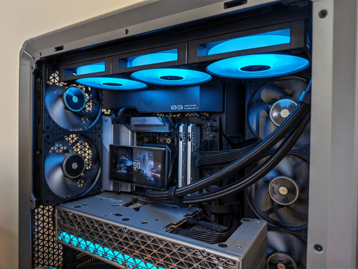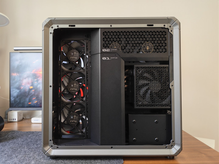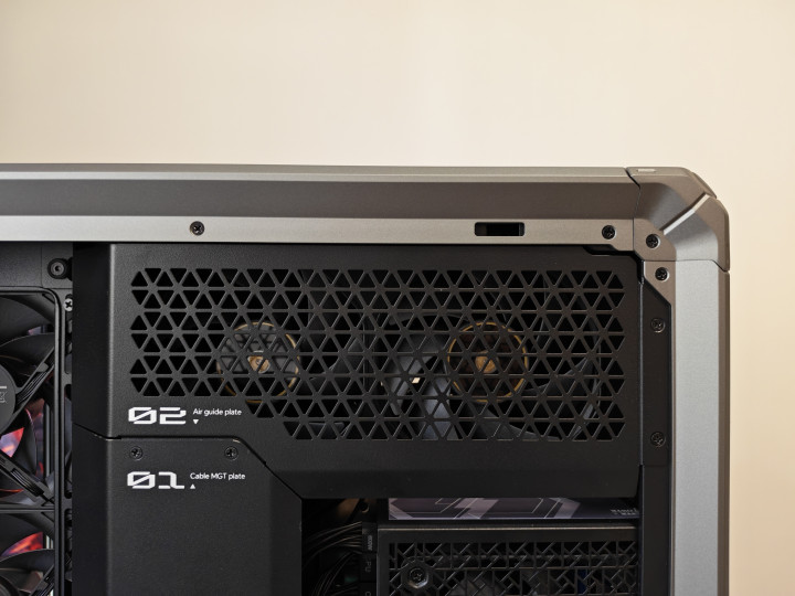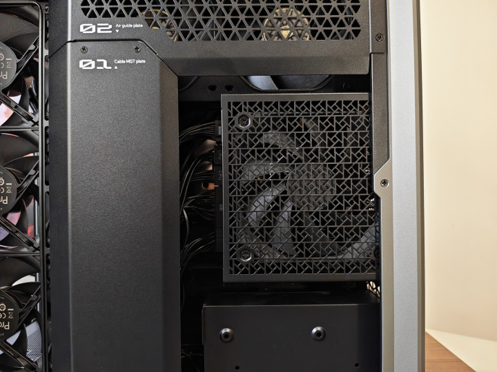双电扇藏于背仓理线挡板下,既不影响理线整洁,又能给主板供电区域元件补充散热,兼顾颜值与性能。