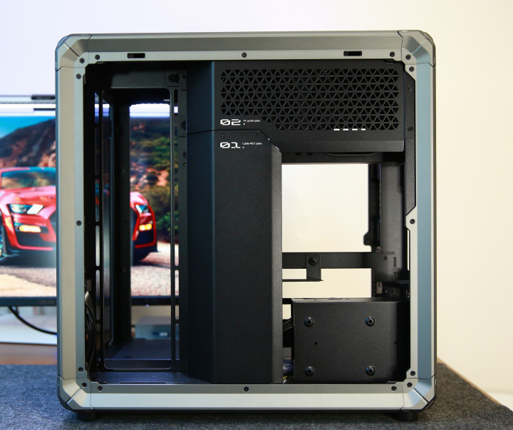 机箱禁受背靠背双仓式结构,电源与硬盘支架均位于主板托板背部,浩荡的背线仓预留了充足的理线空间,只需粗莽梳理,就能让线缆轻重缓急,极大简化了理线设施,况兼两块理线挡板是点睛之笔,理线之后盖上挡板,总共线材都盖在里面,视觉遵守尽头整皆利索。