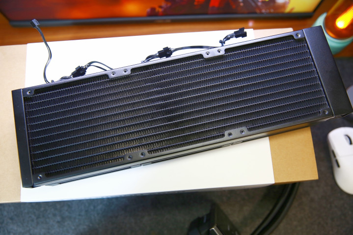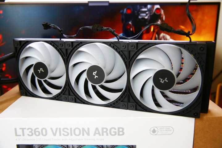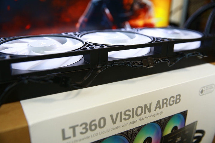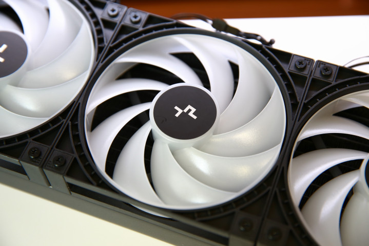 LT360冷排预装了三把12CM ARGB电扇,禁受镂空扇框经营,四个侧边中间均有长方形镂空孔,可径直看到扇叶边际,视觉遵守特有。