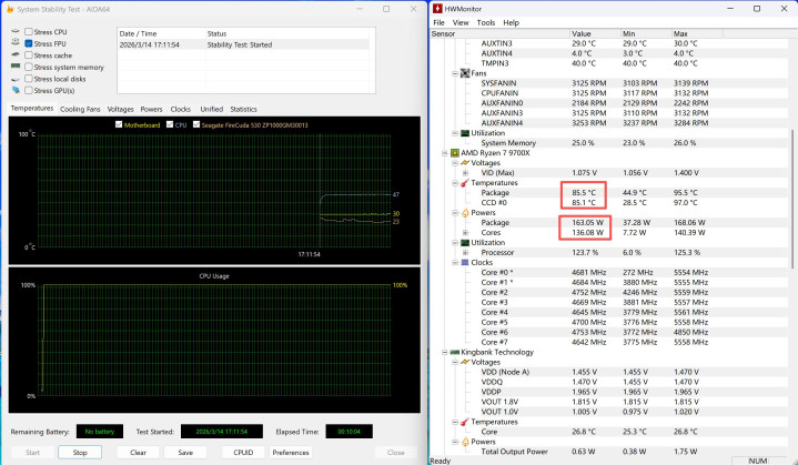 CPU开启PBO超频之后,不竭单烤FPU,10分钟后CPU温度85.5摄氏度,CPU的性能开释达到了163.16W,成绩于机箱用心机划的风说念和水冷散热器强悍的散热遵守,这个温度限度尽头出色。