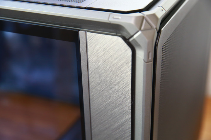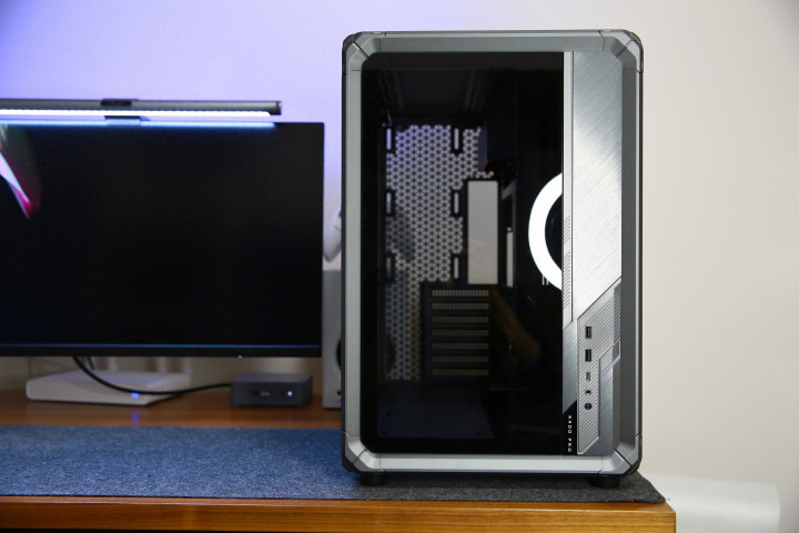 机箱右侧是一大块高透气冲孔MESH板,既保证了散热气流的顺运动过,又与左侧玻璃形成虚实对比,搭配铝合金框架,让整机视觉端倪愈加丰富。