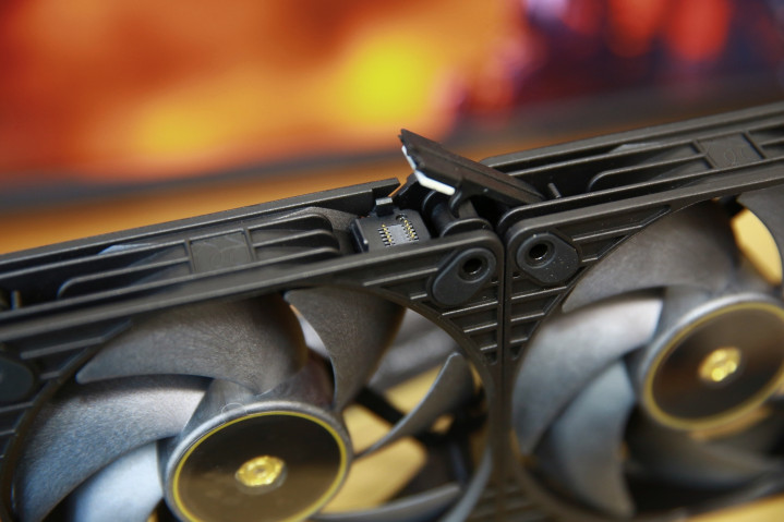 ProArt 创梦PF120电扇配备专利菊链式连结器,一侧为10针公母接口,另一侧为触点连结模块,勾通扇框边际的卡扣,可完结电扇的无缝串联,大幅简化多电扇装配时的理线历程。