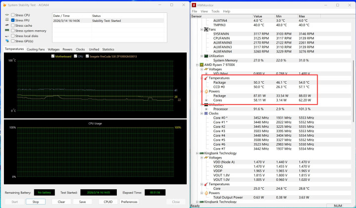CPU默许频率下,大开AIDA64,单烤FPU 50分钟后CPU温度来到50.3°,CPU功率开释87.81W,这个温度比我之前的上一个水冷散热器低了近8度,散热上风尽头昭着。