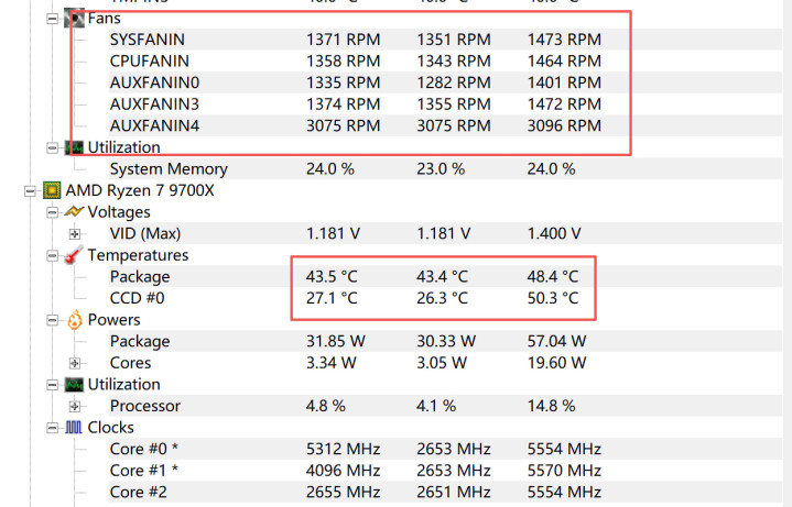 室温23℃的情况下,遍及办公 CPU平均温度43度°,CPU电扇转速1300转足下,AMD 9700X CPU的积热问题是通病,即使待机也很难压低温度。