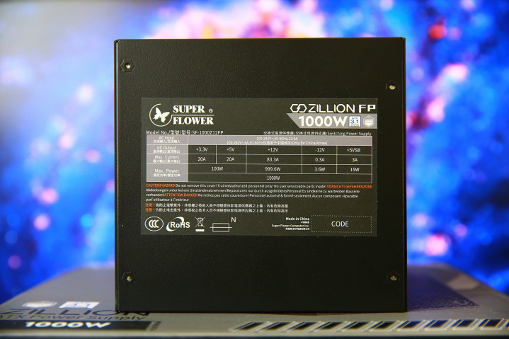 电源的底部贴有能干的参数铭牌,清亮标注了输入输出规格、认证信息及防护功能,撑捏100-240V全幅电压输入,群众通用,单路+12V输出电流高达83.3A,等效功率999.6W,险些接近额定1000W,能充分称心旗舰CPU与50系显卡的供电需求。