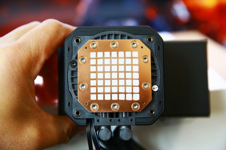 冷头的周围环绕4条ARGB灯带,主机点亮后与屏幕互相呼应,冷头里面搭载九囿风神第6代自研PWM水泵,禁受3相6槽4极电机驱动,最大转速可达3400RPM±10%,既能保证散热遵守,又能精确限度杂音,入手泄气高效。