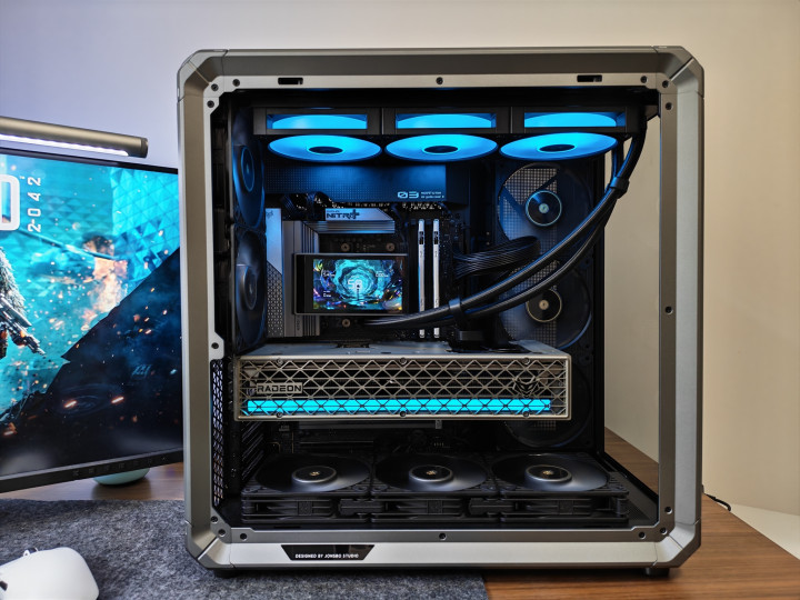本次装机禁受的机箱是乔想伯X400 PRO机箱 、电源是振华ZILLION卓凌 P1000W白金全模组电源、水冷是九囿风神LT360 VISION ARGB水冷散热器, 三者组合成了完整、机箱电扇是华硕ProArt 创梦PF120电扇调解的举座。
