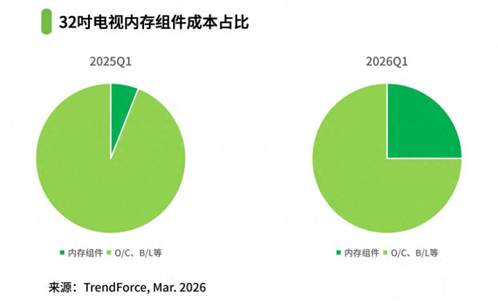 其中,中小尺寸电视受到加价冲击波影响最大。以32吋电视的内存组件本钱占比为例,从2025年Q1的6%骤增至25%,出产本钱同比大涨28%,即便电视品牌还是调高了10-12%的零卖价。但从具体走势来看,可能如故追不上和填不悦内存条本钱飞腾后带来的穴洞。