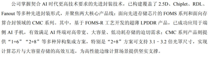 FOMS系列与CMC系列两人人具线中,FOMS-R工艺已用于超薄LPDDR家具,可诈欺于端侧AI手机,CMC的“2+8”有辩论可撑执更大光罩尺寸,用于连气儿计议芯片及大容量存储。