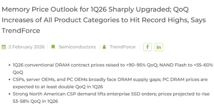 一是高端产能正在向HBM和先进DRAM集聚,传统DRAM、NAND和其他奢侈级家具的灵验供给,反而受到挤压。TrendForce在2026年头的判断等于,一般型DRAM与NAND价钱显赫上行,背后等于行状器与AI需求拉动、供给偏紧以及原厂资源从头分拨。