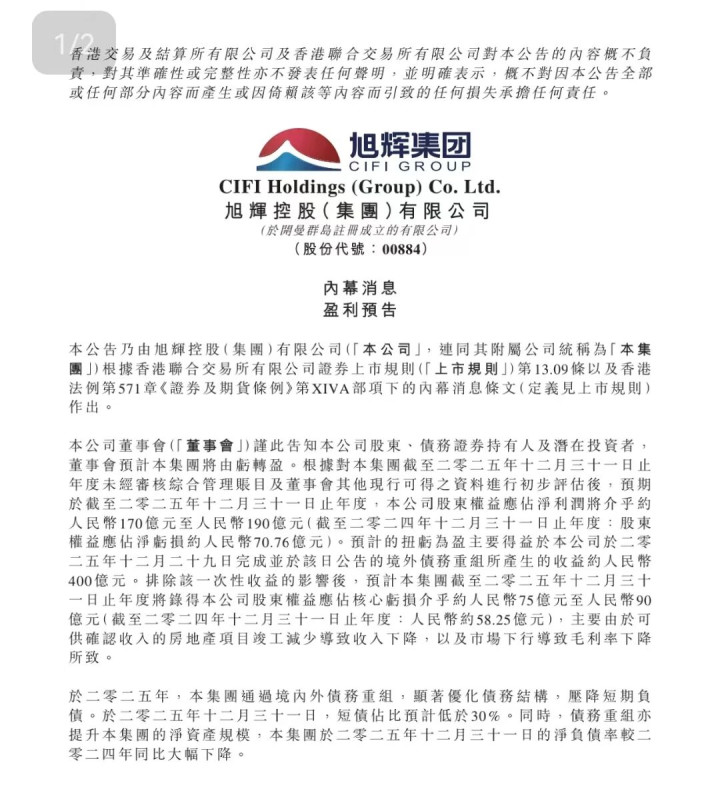 旭辉控股2024年巨亏71亿元,到2025年中报仍然赔本64亿元。本年3月16日预报2025年全年将扭亏为盈,盈利170-190亿元。