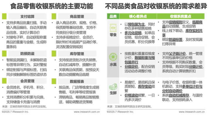 食物零卖收银系统通过集成支付结算、商品照料、防盗防损、库存照料、会员照料等模块,匡助企业擢升收银链路的运营恶果,精确放胆食物的损耗与本钱,同期以数据运转选品和营销战术。收银系统行为食物零卖企业联接奢华者的庞大场地,是联接东谈主-货-场的数据核心,将连接股东企业向数字化决策转型。细分行业角度来看,不同品类因其本身特征和销售方式的不同,收银系统也需要适配各品类对多规格销售、促销法例和保质期管控等需求。如零食以预包装为主,侧重多元化促销,生果存在散装称重与预包装并存的情况,依赖父子级计价和分级订价,生鲜易损耗且价钱波动常常,强调时效性照料。