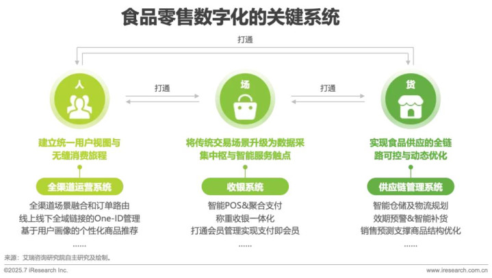 食物零卖数字化的核心在于重构东谈主、货、场三者的协同关系。其中,“东谈主”的数字化聚焦奢华者,需构建以奢华者为中心的全渠谈运营体系;“货”的数字化强调商品全链路透明可控,条目建立高效透明的供应链照料体系;“场”的数字化则关心传统交往场地向数字化核心转型。在此流程中,收银系统将行为关节数据的触点,与供应链照料系统、全渠谈运营系所有同组成食物零卖数字化的“铁三角”。三者联动,以奢华者行为数据运转商品优化,供应链反馈恶果赋能全渠谈践约,股东食物零卖行业从单点数字化向全面的东谈主货场协同进阶。