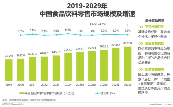 中国食物零卖行业的举座规模尽头宽广,2024年食物饮料零卖GMV也曾逾越7万亿元,谋划到2029年将增长至8.7万亿元。从增长运回身分来看,下千里商场受益于物流等基础步履的完善和需求侧奢华升级的趋势,将产生巨大的规模红利。与此同期,量贩零卖模式加快对供应链端校正,以高性价比的优质居品占领商场,而即时零卖模式侧重线上线下的深度会通,依靠“线凹凸单-即时配送”安静碎屑化奢华需求。在这一流程中,数字化越来越成为食物零卖企业关节的竞争要素,关联数字化厂商如能把执商场红利,将来成漫空间将更为盛大。
