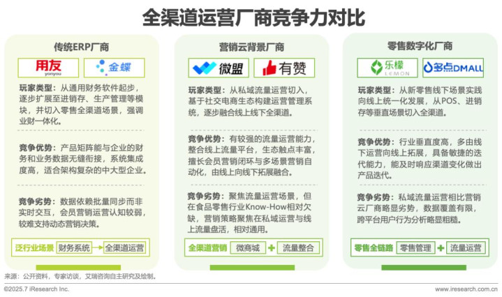 办事食物零卖全渠谈运营的厂商把柄上风及厂商布景可分为三类:(1)传统ERP厂商:依托系统集成与业财协同上风办事大型企业,早期非云原生架构导致容器化部署滞后;(2)营销云布景厂商:以云原生底座维持敏捷迭代,通过AI运转公私域流量自动化运营;(3)零卖数字化厂商:依托行业场景深度优化流量转动。三类厂商均朝着优化基础居品架构、强化行业垂直算法、多维数据智能分析的地方发展,最终以“云原生基座+全域数据智能+场景化器具”重构全渠谈流量运营竞争力。
