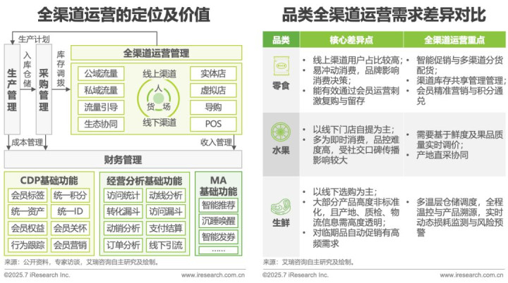 全渠谈运营系统是食物零卖企业整合多触点业务、千里淀数据钞票、重构东谈主货场关系的核心引擎,通过整合线上线下数据流、物流与资金流,重构价值链:(1)数据千里淀:长入千里淀商品、会员、交往数据,构建长入的会员标签体系与销售数据分析体系。(2)盘活客户:基于全域行为画像终了缜密化运营,从流量获得转向用户LTV挖掘。(3)估量分析:整合全域销售数据,分析转动率与健康度,完成数据反哺业务的闭环。在营销运营花样,零食需冒昧高频次、多SKU的长尾需求,强调渠谈互异化订价与精确营销。生果易受季节与时效影响,需分级订价与损耗放胆。生鲜因高损耗、短保鲜期,核心诉求在于以销定产与快速盘活,关心临期品促销。