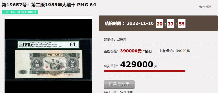 大家看,这是前几年在网上的拍卖会上拍出的一张第二套东说念主民币1953年的大黑十纸币,这张纸币的拍卖价钱达到了429000元。
